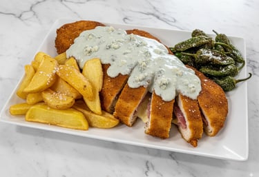 En "El Gat Negre", siempre estamos buscando "hacer algo diferente y llamativo". Y si hay un plato que encarna esa filosofía, ese es nuestro espectacular cachopo. Aunque sus raíces nos llevan a la verde Asturias, hemos adoptado esta joya gastronómica para darle nuestro toque personal y convertirla en una de las estrellas indiscutibles de Terrassa.