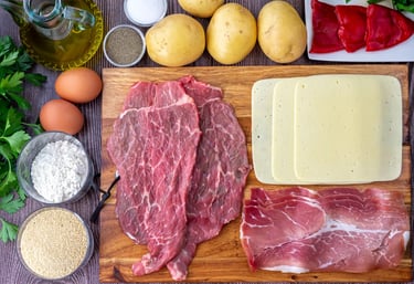La Carne: La base de todo. Utilizamos filetes de ternera de primera, seleccionados por su ternura y sabor. Antes de montarlo, los preparamos para que queden finos y se cocinen a la perfección.